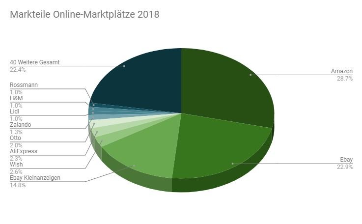 Amazon ist mit einem Marktanteil von 28,7 Prozent deutlich vor Ebay mit 22,9 Prozent und Ebay Kleinanzeigen mit 14,8 Prozent. Danach kommt eine sehr große Lücke. Denn die nächsten Online-Händler erreichen nicht einmal die 3 Prozent-Marke.