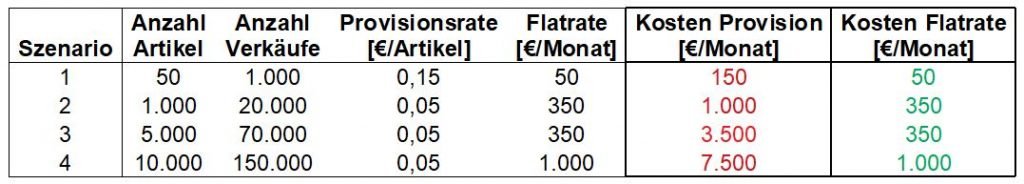 Für diese Artikelanzahl liegt die Provisionsrate je nach Anbieter zwischen 0,15€ und 0,25€. Gehen wir von der günstigsten Rate mit 0,15€ aus, zahlt der Shopanbieter 150€ im Monat für 1.000 verkaufte Artikel.