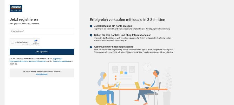 Klicke bei Idealo auf “Jetzt kostenlos registrieren”. Bevor du zur Registrierung geleitet wirst, werden dir die Voraussetzungen für die Anbindung deines Shops bei Idealo angezeigt.