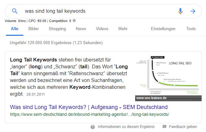 Kennen Sie die „Position Zero“? Das ist das Suchergebnis, das Google von einer Website zieht, es in eine Box pack und als „Featured Snippet“ über den organischen Suchergebnissen anzeigt: